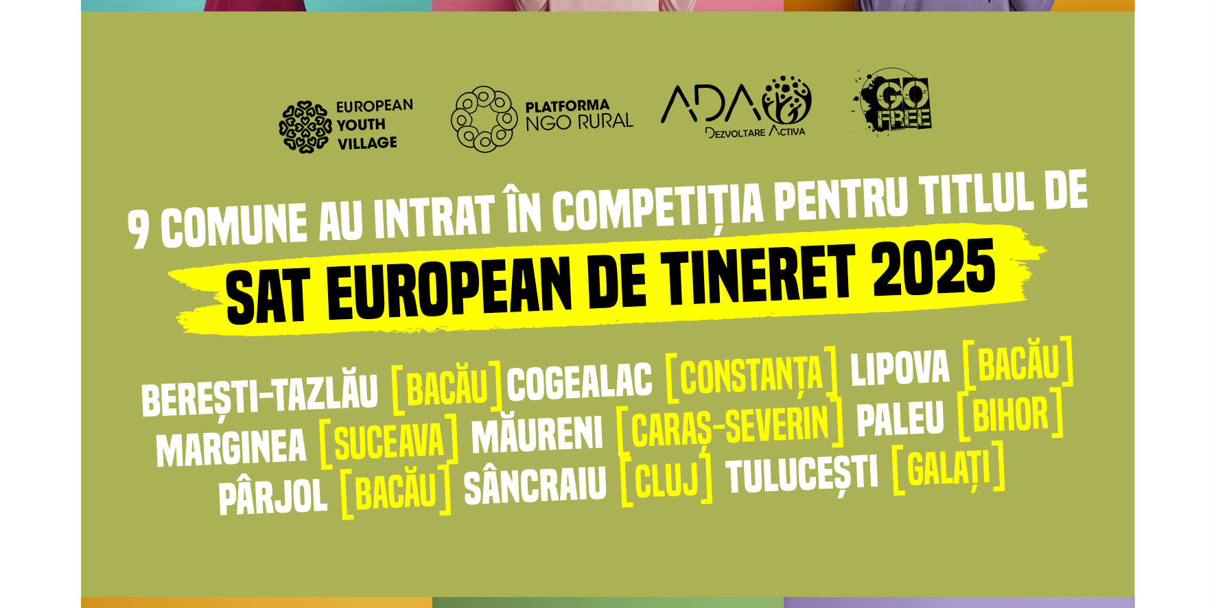 Ne bucurăm că tinerii din mediul rural continuă să se organizeze la nivel local și vor să contribuie la dezvoltarea comunităților lor sub umbrela programului European Youth Village. 9 comune din România s-au înscris anul acesta în competiția pentru titlul de Sat European de Tineret. După ce Guvernanța programului European Youth Village a evaluat candidaturile din punct de vedere al eligibilității, putem confirma faptul că toate cele 9 comune merg mai departe în semifinala competiției.