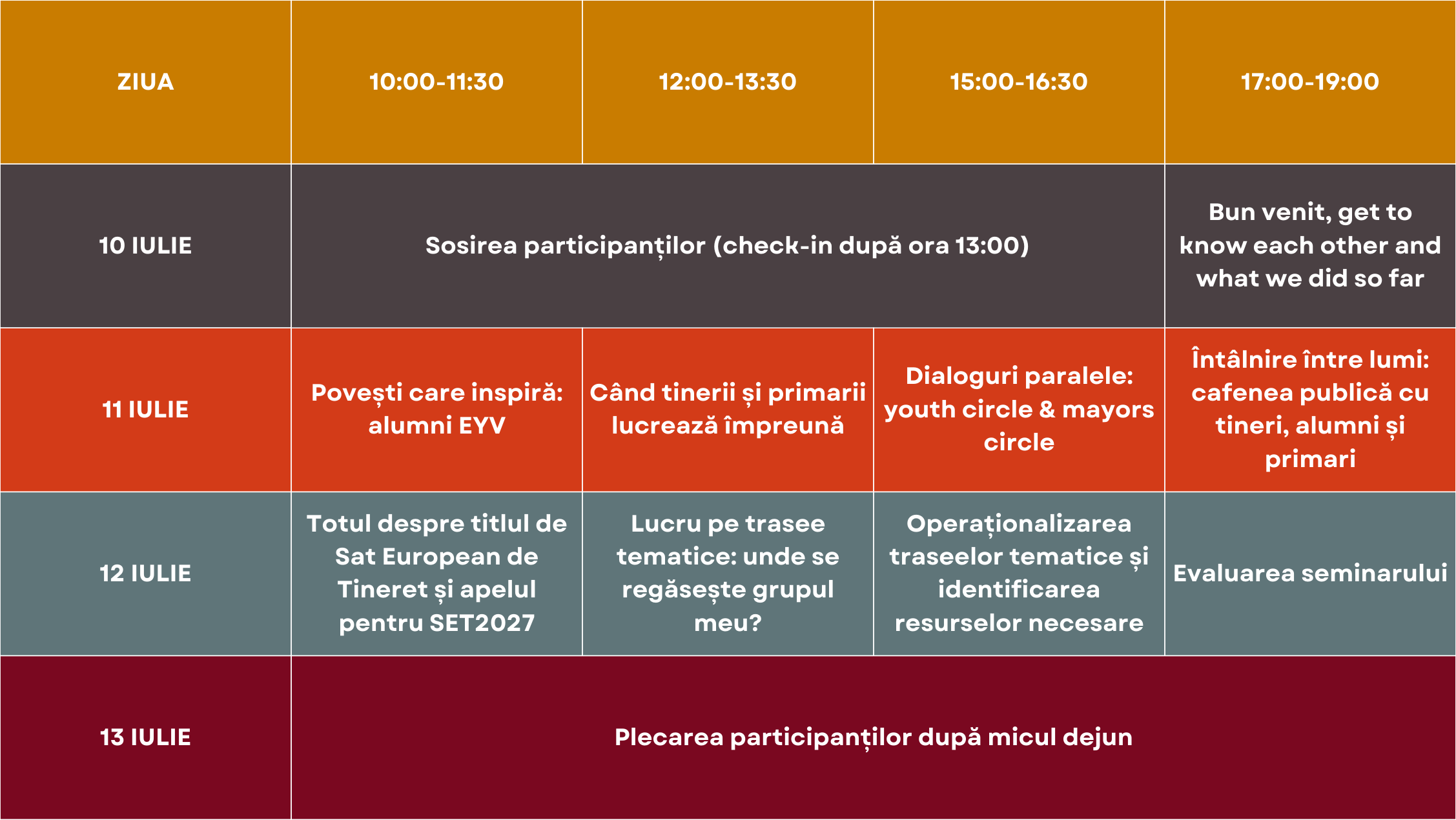 În cadrul acestui seminar, tinerii vor avea ocazia să împărtășească ce au reușit să facă în comunitățile lor în perioada sprinturilor comunitare: ce activități au organizat, ce reacții au primit din partea altor tineri și ce provocări au întâlnit pe parcurs.