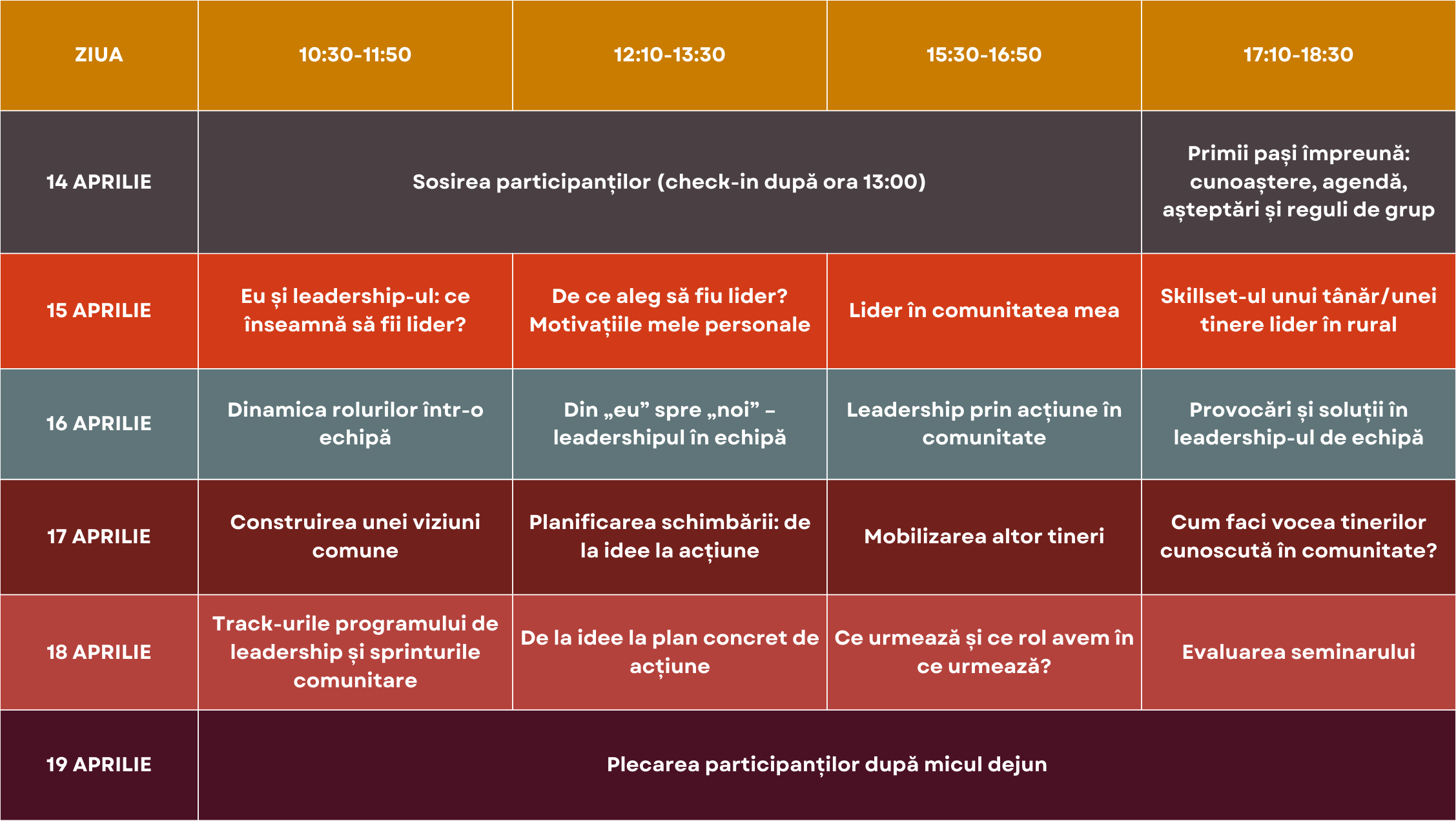 Prima activitate din cadrul programului de leadership este mobilitatea LEARN, în care cei 20 de tineri se întâlnesc pentru câteva zile (14-19 aprilie) în Bran pentru un training intensiv de leadership și implicare civică. Este momentul în care punem bazele comunității programului, explorăm împreună valorile care ne aduc aici și începem să lucrăm concret la ideile pe care fiecare participant le are pentru comunitatea sa. Tot aici vom discuta și despre primele sprinturi comunitare pe care participanții le vor organiza în satele lor după ce se vor întoarce acasă. Astfel, la finalul întâlnirii, fiecare participant va pleca cu un plan personal de acțiune, care va ghida primii pași pe care îi va face în comunitatea sa în lunile următoare.