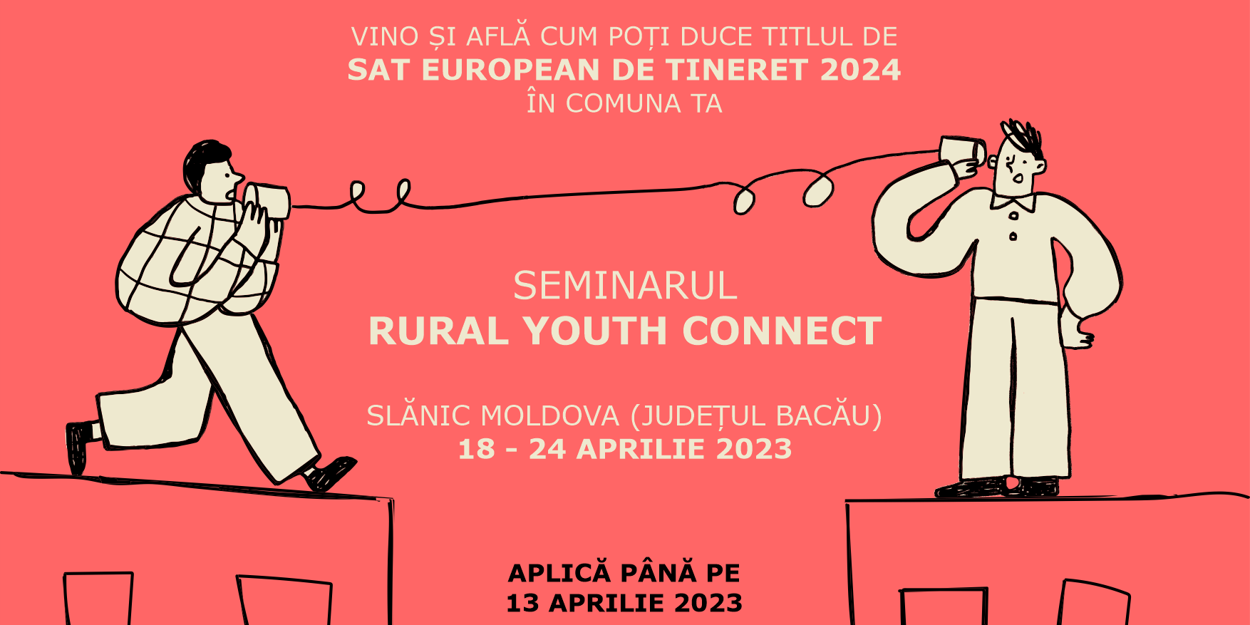 Pentru a participa la Seminarul RURAL YOUTH CONNECT din Slănic Moldova, județul Bacău (18-24 aprilie 2023) te rugăm să completezi formular online disponibil AICI până cel târziu 13 aprilie 2023, la ora 23:59.